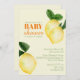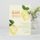 Diese individuelle Baby Dusche lädt mit einem Zitrusmotiv auf hellgelbem Hintergrund ein. Zwei Aquarellfarben-Zitronen werden oben rechts platziert, eine weitere Zitrone im unteren links. Der Titel "Baby Shower" ist in einer lebhaften orangefarbenen Farbe gedruckt, die Erholung des Textes in einem Kalkgrün.