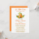 Moderne elegante Wasserfarbe Orange Eine kleine Süsse befindet sich auf dem Weg Orange und Gold Baby Dusche Einladung enthält Aquarellblumen. Gelbe Sonnenblumen, rosafarbene Rosen und Pfannkuchen im botanischen Grün.