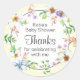 Dieses Dankeschön-Aufkleber ist perfekt für Baby Dusche Gefälligkeitstaschen und danke Ihnen Karten Umschläge. Der Aufkleber enthält weiße, rosa, blaue, lila und grüne Blume und Blattwerk. Der Text ist grau.
