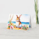 Osterhasen an einem tropischen Strand mit Blume und Eiern.