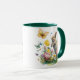 Die Tasse des Kaffees zeigt eine Aquarellillustrierung eines braunen, sonnigen Hasses, der aus einem Frühlingsgarten mit gelben Tulpen, Rosa/Rose-Tulpen, Narzissen und Grünpflanzen kommt, um farbenfrohe Schmetterlinge zu fangen, die herumwirbeln. Zusätzliche Stile und Felgen- und Grifffarben sind verfügbar.