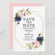 Die elegante Watercolor Rosa Blush Rose und Blue Rose Save the Date Wedding Announcement Card beinhaltet botanisches Grün auf einem goldenen geometrischen Rahmen. Zurück pink.