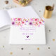 Moderne und niedliche Aquarellblumen in Rosa und Lila mit Blätter und Polka-Punkten und dem lila Herz in der Mitte