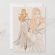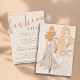 Ein handgemaltes, wasserfarbenes Erdbeerblonde-Modemodell mit einem fließenden beigen Gewand auf einer stilvollen Wohltätigkeit Benefizshow-Einladung in neutralem Creme