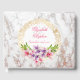 Ein hochzeitliches Gästebuch mit modernem Design - mit elegantem Hintergrund aus weißem Marmor (Imitate). Oben platziert ist ein kreisförmiger Rahmen mit einem goldenen Zierrahmen. Große rosa und lila magnolische Blume mit grünen Akzenten schmücken das Design. Personalisieren Sie mit Ihren Namen und Hochzeitstermin.