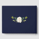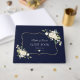 Elegantes Kartendesign mit feinen, weißen Blume und grünen Blätter in Aquarellfarben, einem vergoldeten Rahmen aus Imitaten, einem Blumenteil auf dunkelblauem Hintergrund. Auf der Rückseite weiße Blume Bouquet. Verwenden Sie das Tool Personalize, um Ihre Informationen hinzuzufügen, Schriftart zu ändern, die Farben des Schriftartes zu ändern. Für passende Artikel besuchen Sie bitte meine Delicate White Blume Collection.