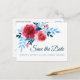 Elegantes, Save the Date hochzeitsankündiges Postkartendesign mit Aquarellblumen und Blattwerk auf einem schlichten, weißen Hintergrund.