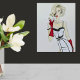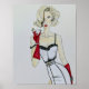 Eine handgemalte Blondin in Aquarellfarben, die mit einem formschönen Schwarz-Weiß-Rock und einer Decke mit auffallenden, langen, roten Abend-Handschuhen, die einen Martini auf einem stilvollen Modeposter tragen, ein Button nach oben trägt