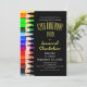 Dieses lustige Kindergeburtstag Party Einladung Design verfügt über eine Säule von Regenbogenfarben Stifte. Alle Party-Details sind vorne mit gelbem Schriftart für das Party und Namen Informationen. Füllen Sie die Textfelder der Vorlage unter Personalisieren aus, entfernen Sie alle Informationen oder klicken Sie auf Anpassen, um einen Schriftart auszuwählen, den Sie bevorzugen.