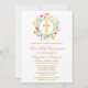 Moderne elegante Wildblumen Watercolor Wreath First Heilige Kommunion Einladung umfasst zarte, gelbe, rosa, pfirsichblaue, staubige, schlaue, lila, rote und orange wilde Blume, Pfeffer, Eukalyptus-Blätter und andere schöne botanische Vegetation. Gold Cross. Rosa rot Zurück.