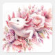 Aquarellfarbener Axolotl unter rosa Blume Quadratischer Aufkleber