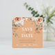 Blumen & Licht Orange Peach Wedding Square Ankündigung Datum freihalten Karten Elegante Aquarell Blume & Blattwerk in neutralen und erdigen Farben auf einem grauen Holz treffen sich zu einem atemberaubenden modernen und eleganten Spätsommer / Hochzeit im Herbst Thema. Brauchen Sie mehr Platz? Karo unsere zusätzliche Version mit Backside Text & optional Hochzeitseinladungen. Doppelseitiger Druck. Foto Bild zurück. Enthält Umschläge. Orange, Terrakotta, Salbei, Creme, Pfirsich & Grüntöne mit einem schicken rustikalen boho inspiriert Design auf hellen Holz.