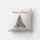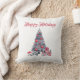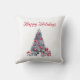 Ein stilvolles Happy Holidays Kissen in Rot-, Schwarz- und Grautönen. Das doppelseitige Design zeigt eine Aquarellbilder von Pinguinen, die unter einem Weihnachtsbaum schlafen, mit Happy Holidays in einem handgeschriebenen roten Schriftart.
