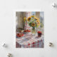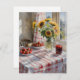 Ein Tisch am sonnigen Fenster ist mit einer Vase aus Sonnenblumen, einer Schüssel Erdbeeren und einem Glas Konfitüre geschmückt. Durch das Fenster strömt sanftes Sonnenlicht, das eine warme und einladende Atmosphäre schafft.