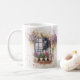 Tasse mit der schönen Aquarellmalerei eines Fenstergartens mit bunten Blume.