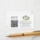 Die moderne Watercolor Green Floral Wedding RSVP Card mit Ihrem QR Code beinhaltet weiße Pfannkuchen und botanische Vegetation.