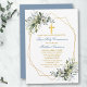 Elegante Watercolor Grüne Erste Heilige Kommunion Einladung beinhaltet Aquarellfarben Eukalyptus Blätter und andere schöne botanische Grünpflanzen. Gold Cross. Dusty Blue Back.