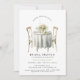 Niedliche Brautparty-Brunch-Einladungen mit einer Aquarellbilder eines extravaganten Tisches und Stühle. Die Rückseite ist ein abstrakter Aquarellhintergrund mit verschiedenen Grüntönen.