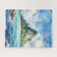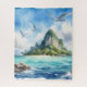 Mysteriöse Insel inmitten des Ozeans umgeben von Möwen. Und sind diese Häuser, die ich am Rande des Dschungels sehe? Im Stil einer Aquarellmalerei.
