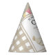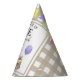 Wasserfarbenes niedliches Huhn oder Hahn in Geburtstagshut, Kuchen mit Beeren, lila Ballon, festliche Garage mit Fahnen. Beigefarbener Käfighintergrund.