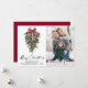 Moderne Elegante Kalligraphie Tinte Aquarellfarben Wintergrün mit Burgundy Red Ribbon Bow Weihnachtsschmuck, Pine Cones und Holly Berries Foto Merry Christmas Card - Rot