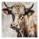Eine Kuh mit detaillierter Wasserfarbe mit ausdrucksvollen Augen wird vor einem weichen, verschwommenen Hintergrund dargestellt. Die natürlichen Farben verstärken das lebensechte Aussehen.
