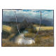 Künstler von Zolotareva. Aquarell auf Seide - manuelle Ausrüstung;Die umliegenden Landschaften sind surreal in ihrer Schönheit. Wasser im See reflektiert den kalten Herbsthimmel.Früher gab es große Bäume um den Teich.Man kann Namen oder Text hinzufügen.