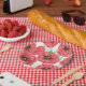 Pflaumen in Aquarellfarbe auf Papier. Muster in Fotoshop gemacht.
