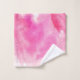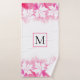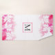 Modernes, rosafarbenes Ahornblatt Wasserfarbenwäsche und monogramm Set Bath Handtuch. Das Badetuch weist einen Rahmen mit Blätter aus weißem Ahorn auf, die auf einem rosa Aquarellspüler und in einem Rahmen mit Kontur in der Mitte platziert sind. Das Handtuch zeigt ein Muster der Ahorn-Blätter, und das Waschlappen ist mit rosa Aquarellspritze bedeckt.