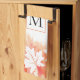 Moderne Korallenblattwäsche, Aquarellspülen und Küchenhandtuch in Monogramm. Es ist mit einem Rand von weißen Ahorn Blätter auf lebende Korallen Wasserfarbe Waschmaschine und Ihr Monogramm in einem Rahmen mit Kontur in der Mitte.