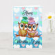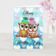 Glückliche Valentinstag-Karte. Niedliche Aquarelluhmen, die auf einem Zweig sitzen und sich an einem kalten Schneetag zusammenkuscheln. Romantisch und geschnitten Weg zu sagen Happy Valentine's Day und ich Liebe Sie. Aquamarine und rosa Herzen.