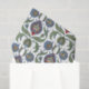 Arabesque verzierte Blumenmuster in den Farbtönen Olivgrün, Buchenblau und warmes Rot. Blätter, Stiele, Blüten und vergessen Sie mich nicht.