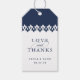 Bringen Sie diese eleganten marokkanischen inspirierten Geschenketiketten an Ihre Gastgeschenke Hochzeiten an, um Ihre Liebe und Ihren Dank auszudrücken. Die Tags wurden für die Koordination mit unserer Arabesque Hochzeitseinladungskollektion in Navy konzipiert und weisen eine geometrische obere Grenze in Marineblau und Weiß auf, mit "Liebe und Dank", Ihren Namen und Ihrem Hochzeitstermin darunter. Die Rückseite ist leer für Ihre benutzerdefinierte Nachricht oder einen handgeschriebenen Gruß.