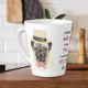 Hier ist die perfekte Latte Tasse für den Mops Besitzer! Auf jeder Seite ist ein Portrait eines niedlichen Mops. Man trägt einen Hut im Stil eines Sombrero und eine rote Sonnenbrille. Der andere trägt einen Hut eines Schmetterlings und eine rot-weiß gestreifte Krawatte. Zwischen den Bildern ist schwarzer und roter Text, der sagt: "Ich arbeite HARD, damit mein MOPS ein besseres Leben haben kann". Niedlich!