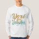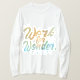 Dieser T - Shirt zeigt den Slogan "Work for Wonder" in einem lebhaften Regenbogenverlauf. Jedes Wort ist eine andere Farbe, die eine mutige und erfreuliche Aussage erzeugt