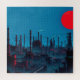 Eine komplexe Industrielandschaft wird mit mächtigen Strukturen dargestellt, die an einem grünen Himmel versilbert sind. Ein kühn blauer Kreis kontrastiert mit den strukturierten Wolken im Hintergrund.