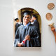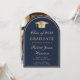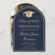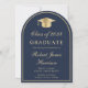 Formale Ankündigung eines blau-bogenförmigen Uni-Abschlusses mit einem goldenen Graduiertenmütze, dem Namen und dem Klassenjahr des Absolventen in einem eleganten Goldskript, ihrer Hochschule, ihren Hauptdiplomen und Ehren in klassischer Serifentypografie und ihrem Foto auf der Kartenrückseite.