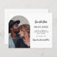 Ein Foto Save the Date Karte für Ihre Hochzeit. vorne: Fügen Sie Ihr eigenes Foto in vertikaler Größe in den Rahmen des Fotos ein. Ein schick weißer Hintergrund, schwarzer Text. Vorlagen für Namen und Datum. Der Name und der Text: Save the Date sind mit einem modernen handgeschriebenen Stilskript geschrieben. Zurück: Sie können mehr Text hinzufügen, wenn Sie gewollt haben. Gehen Sie in das Design-Tool und fügen Sie auf die hintere Ebene. 1 Blatt = 1 Save the Date bedruckte Kante bis Kante.