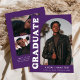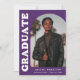 Stilvolle und trendige Ankündigung des Abschlusses mit dem Foto des Absolventen auf der Vorderseite mit einem Offset-Bogen-Foto. "Graduate" wird auf lila Hintergrund in fett weißem Retrobuchstaben angezeigt. Personalisieren Sie die Titelseite der Ankündigung des Abschlusses des Erzbischofs, indem Sie den Namen, die Schule und den Abschluss des Absolventen hinzufügen. Die Karte kehrt zurück, um weitere 3 Fotos mit Platz für den benutzerdefinierten Text anzuzeigen, wie z.B. künftige Unis, Karrierepläne, Angaben zur Graduierungspartei, etc. Die Ankündigung des lila Abschlusses ist sowohl für Absolventen der Highschool als auch für Absolventen der Uni ideal.