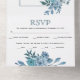 Diese ganzjährig stattfindende Hochzeitseinladung zeigt einen Bogen mit aquamarinen und aquablauen Blumen und Blätter. Das einladende Design besticht durch einen Rahmen mit Rose, Dahlien und blauen Blättern. Zusätzlich enthält die Einladung eine abnehmbare UAWG-Antwortkarte, die Ihnen zusätzlichen Komfort bietet.