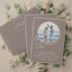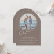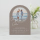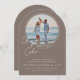 Invite your guests with modern elegance using our arched photo wedding invitation! This unique invitation features a cherished round photo of you and your partner (like a beautiful beach shot) set against a sophisticated taupe solid color background (with more color options available soon!). Your first names are beautifully displayed in a casual handwritten script font, adding a warm, personal touch. The reverse side offers an optional text box for additional wedding details (like accommodations or directions), plus a chic initial monogram and your wedding website at the bottom. This custom wedding invitation is perfect for couples seeking a contemporary, yet timeless design for their special day.