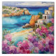 "Arches by the Sea". Eine idyllische Aussicht auf eine wunderschöne Bucht mit einem Single. Ein kleiner Sandstrand ist von einem wunderschönen, azurblauen Meer mit rosa und violetten Blumen gerahmt.