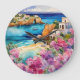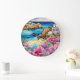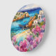 "Arches by the Sea". Eine idyllische Aussicht auf eine wunderschöne Bucht mit einem Single. Ein kleiner Sandstrand ist von einem wunderschönen, azurblauen Meer mit rosa und violetten Blumen gerahmt.