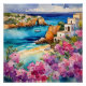 "Arches by the Sea". Eine idyllische Aussicht auf eine wunderschöne Bucht mit einem Single. Ein kleiner Sandstrand ist von einem wunderschönen, azurblauen Meer mit rosa und violetten Blumen gerahmt.