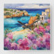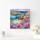 "Arches by the Sea". Eine idyllische Aussicht auf eine wunderschöne Bucht mit einem Single. Ein kleiner Sandstrand ist von einem wunderschönen, azurblauen Meer mit rosa und violetten Blumen gerahmt.