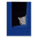 Archie, ein Champagner färbte die Tabbykatze, die durch das leere Fenster einer antiken Tür schaut.
