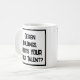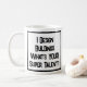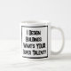 Ein lustiger Slogan auf einer Tasse, die sagt: "Ich entwerfe Gebäude. Was ist DEIN super Talent?" Tasse für einen Architekten. Schwarzweißtext.