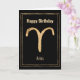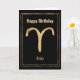 Senden Sie eine personalisierte Glückwunschkarte zum Geburtstag an Ihre Lieblings-Sterne Aries the Ram mit diesem stilisierten Hammergold Aries Astrologie Zodiac Sternzeichen in einem doppelten goldenen Rahmen auf einem schwarzen Hintergrund. Der Happy Birthday und Zodiac Zeichentext auf der Vorderseite der Karte kann personalisiert sein, wenn Sie einen anderen Gruß im Hinterkopf haben. In der Karte kann man den Namen des Geburtstagsmädchens oder Jungen über dem Text hinzufügen, der besagt: Du wirst einen tollen Geburtstag haben, der in den Sternen geschrieben ist. Eine lustige personalisierte Karte für jemanden, der unter dem Sternzeichen von Aries geboren ist.