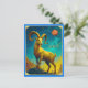 Postkarte in einem majestätischen Widder stehend auf felsigem Gelände, symbolisiert das Sonnenzeichen Aries. Set vor einem kosmischen Hintergrund mit leuchtenden Mars auf dem roten Planeten, die kühlen Hörner des Widders und der intensive Blick erwecken Kraft, Mut und einen feurigen Geist.
