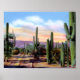 Vintage-Bild einer Wüstenlandschaft irgendwo in der Sonoran-Wüste in Arizona. Es werden Saguaro-Kakteen und Schotterstrassen gezeigt, die zu den Bergen führen.